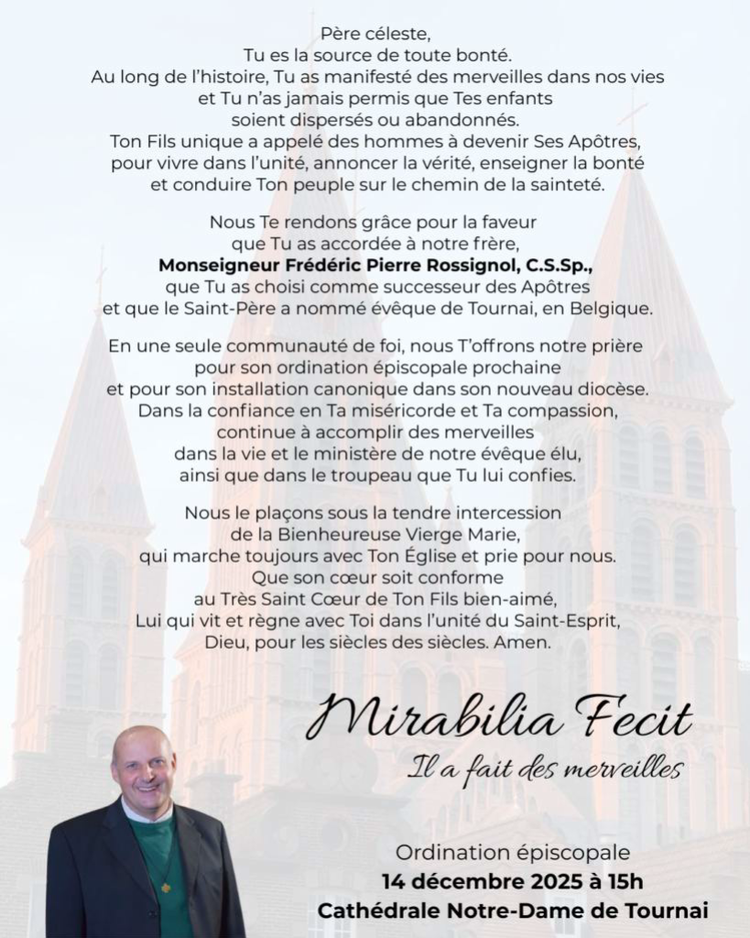 Mgr Frédéric Rossignol sera ordonné le 14 décembre 2025 à 15h à Notre-Dame de Tournai. Accompagnons-le par la prière vers son installation et dans la mission qui lui a été confiée.