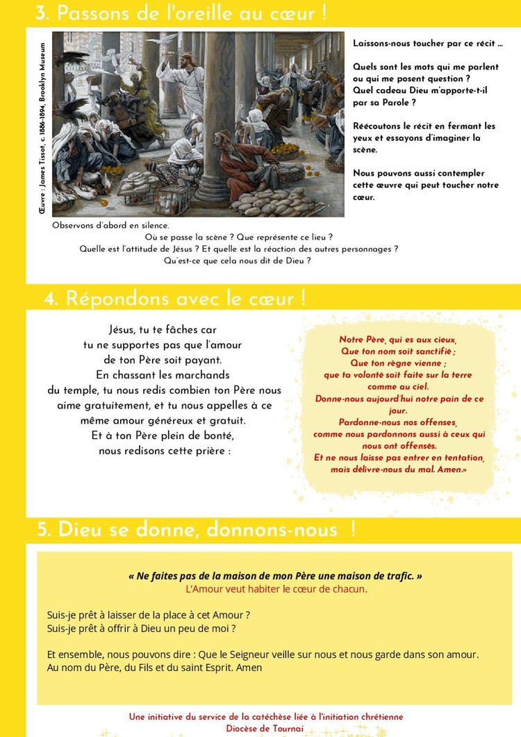« Comme la Pâque juive était proche, Jésus monta à Jérusalem. Dans le Temple, il trouva installés les marchands de bœufs, de brebis et de colombes, et les changeurs. Il fit un fouet avec des cordes, et les chassa tous du Temple, ainsi que les brebis et les bœufs ; il jeta par terre la monnaie des changeurs, renversa leurs comptoirs, et dit aux marchands de colombes : « Enlevez cela d’ici. Cessez de faire de la maison de mon Père une maison de commerce. » Ses disciples se rappelèrent qu’il est écrit : L’amour de ta maison fera mon tourment. Des Juifs l’interpellèrent : « Quel signe peux-tu nous donner pour agir ainsi ? »