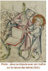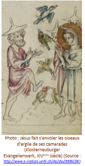 réalisés par Jésus enfant (ainsi, dans l’Evangile selon Thomas, Jésus et ses amis réalisent des oiseaux en argile, puis Jésus leur donne la vie et les oiseaux s’envolent… Mignon comme tout, mais… quel intérêt ?...), tantôt son éducation et comment il va apprendre à lire, tantôt encore comment il va apprendre à user de son pouvoir pour le bien et non pour le mal (on peut lire dans l’Evangile de l’enfance que Jésus n’utilise pas toujours ses pouvoirs escient, et que Joseph se fâche et le consigne à la maison…), etc.