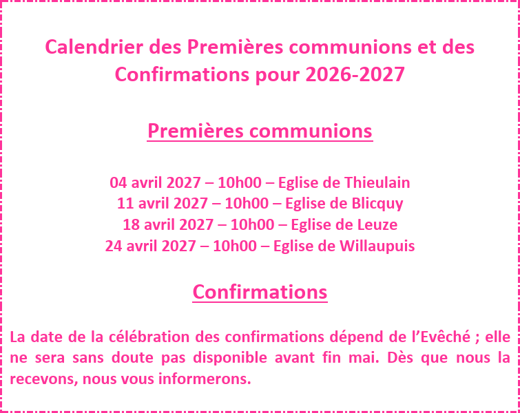 - Le samedi 30 mai, à 14h30, en l’église de Leuze, Jeanne Desmecht, enfant de Sindy Willocq et Arnaud Desmecht ; Raphaël Delbecq, enfant de Florine Duelz et Benjamin Delbecq