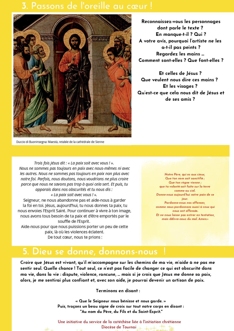 « C’était après la mort de Jésus. Le soir venu, en ce premier jour de la semaine, alors que les portes du lieu où se trouvaient les disciples étaient verrouillées par crainte des Juifs, Jésus vint, et il était là au milieu d’eux. Il leur dit : « La paix soit avec vous ! » Après cette parole, il leur montra ses mains et son côté. Les disciples furent remplis de joie en voyant le Seigneur. Jésus leur dit de nouveau : « La paix soit avec vous ! De même que le Père m’a envoyé, moi aussi, je vous envoie. » Ayant ainsi parlé, il souffla sur eux et il leur dit : « Recevez l’Esprit Saint. À qui vous remettrez ses péchés, ils seront remis ; à qui vous maintiendrez ses péchés, ils seront maintenus. »
