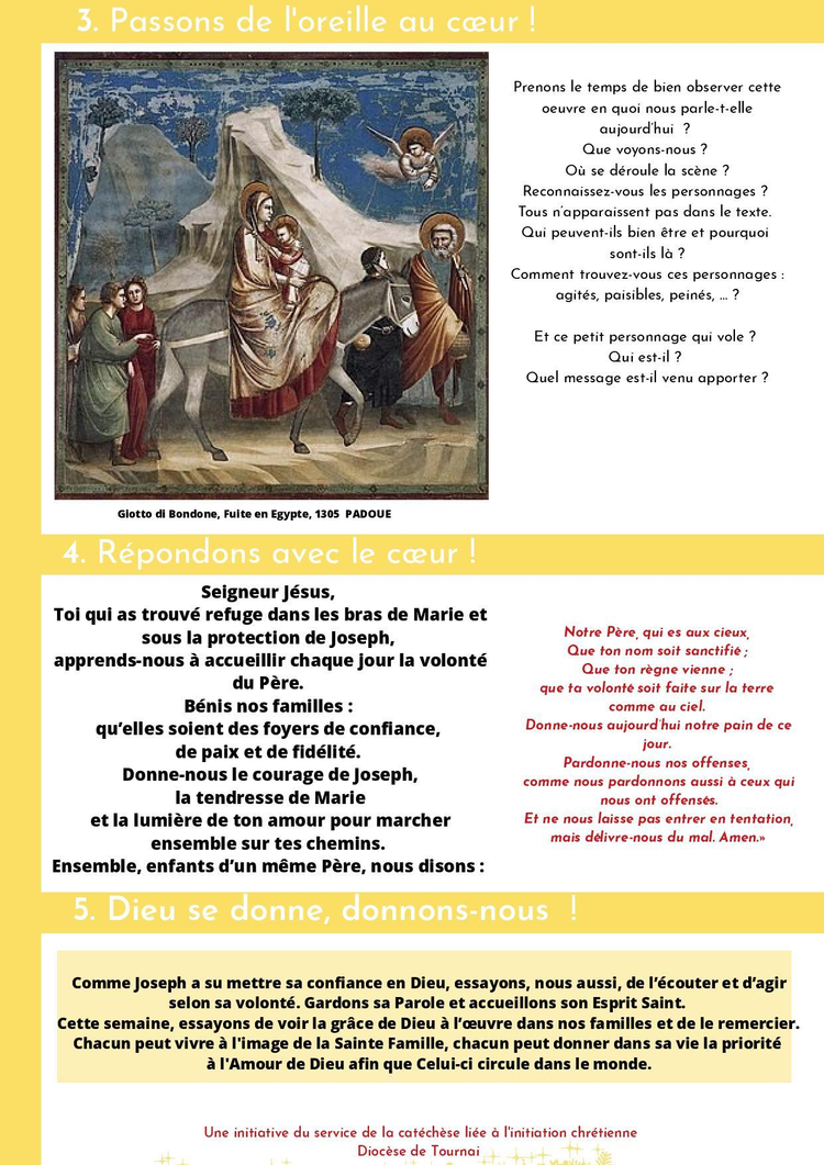 « Après le départ des mages, voici que l’ange du Seigneur apparaît en songe à Joseph et lui dit : « Lève-toi ; prends l’enfant et sa mère, et fuis en Égypte. Reste là-bas jusqu’à ce que je t’avertisse, car Hérode va rechercher l’enfant pour le faire périr. »