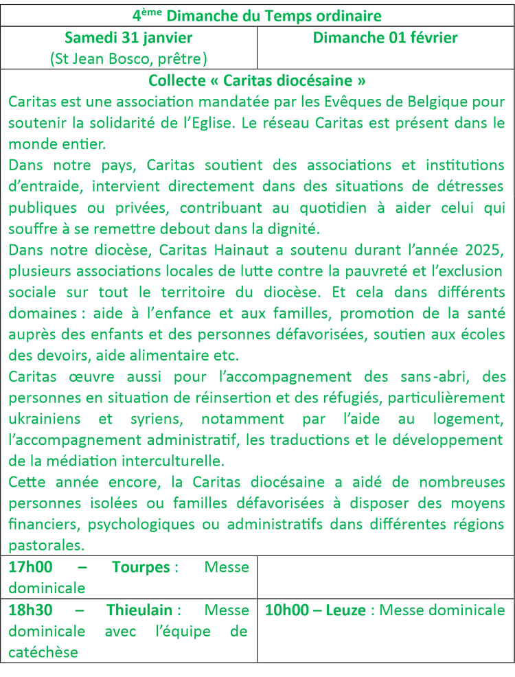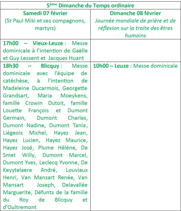 HORAIRES DES MESSES PERIODE EN COURS - Paroisse de Leuze-en-Hainaut